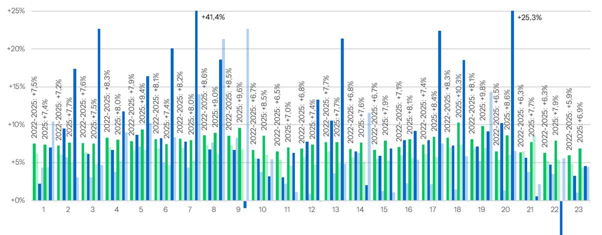 Preisveränderung Mieten in Wien nach Bezirken und Datenauswertung für 2022 bis 2025 bzw. 2024 auf 2025